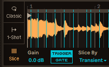 The audio can be sliced by: transient; the beat, best used when the audio is already aligned to the BPM of the project; region, dividing the audio into even slices; or manual, allowing the user to cut up the audio in specific places which is useful for obtaining short drum samples.