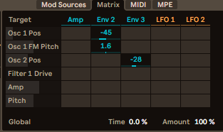 Allows for intuitive mapping of parameters to different modulators. Parameters to be modulated are selected on the left and appear when clicked on elsewhere in the menu. Mod sources are shown at the top.
