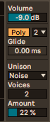 When mono, glide can be utilised to smoothly transition between notes. The slider controls how many (m)s it takes to move from one note to the next